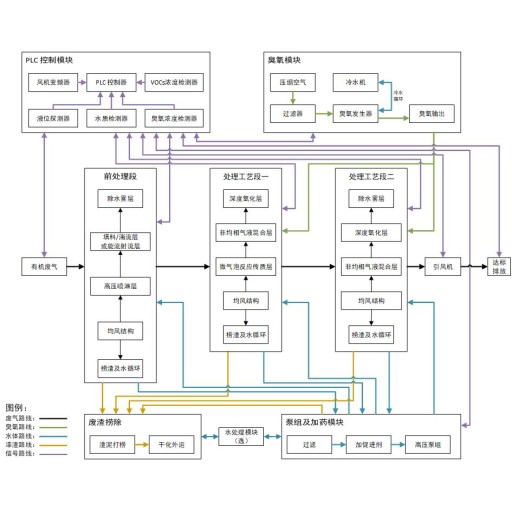 微氣泡深度氧化設備主要利用水、電和少量藥劑,結合微氣泡傳質效率高、溶氣能力強、分解有機物等特點,在高效的水氣固非均相傳質接觸系統內實現水、氣的充分混合和傳質,利用臭氧與催化劑和反應藥劑生產羥基自由基的深度氧化反應,將廢氣中的有機成分礦化分解的目的,從而實現有機廢氣的達標排放。其工藝流程如下所示: